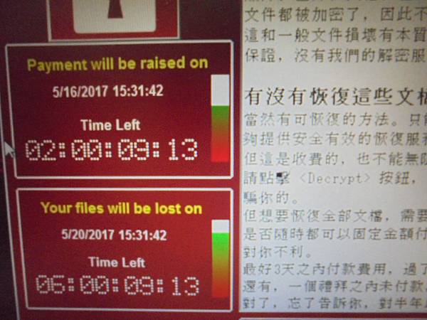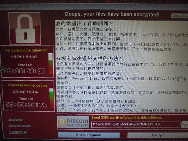 WD威騰1TB→3.5吋硬碟組裝電腦使用~中Wana Decrypt0r 2.0勒索病毒→副檔名被加註.WNCRY~要救回照片檔案→勒索軟體告知視窗~桃園市龜山區-陳小姐【左下方有計時器在跑】