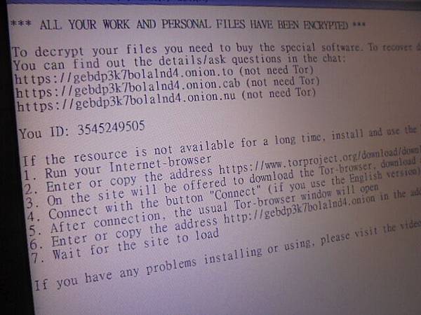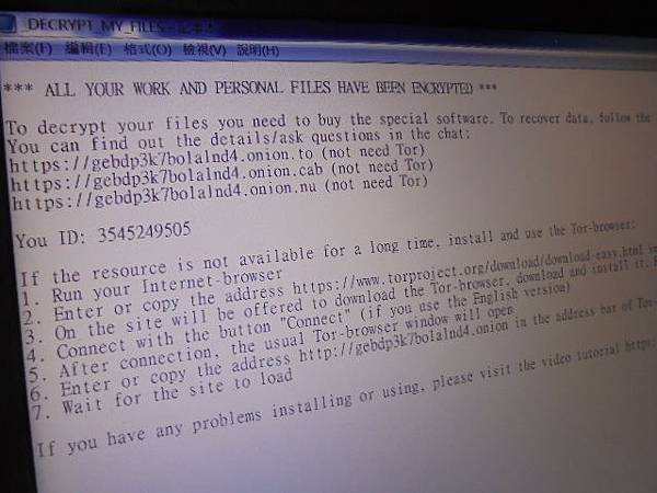HGST昱科320GB→2.5吋硬碟為筆記型電腦資料碟~中綁架勒索病毒→檔名後面加註病毒ID~副檔名被加註Onion→要救回工程圖檔~開啟文字檔案~桃園市龜山區-陳先生【說明病毒ID為10碼】