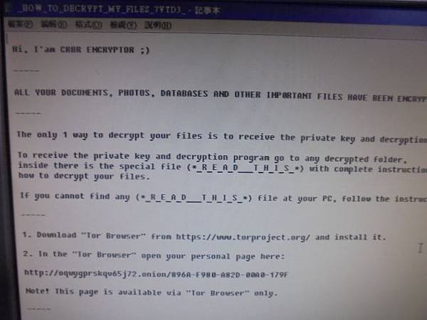 TOSHIBA東芝500GB→3.5吋組裝電腦硬碟~中CRBR勒索綁架病毒→檔名變亂碼~副檔名被加註B4AD→要救回試算表與照片檔案~點進加密病毒說明書→桃園市中壢區-張小姐【簡體中文的字體】