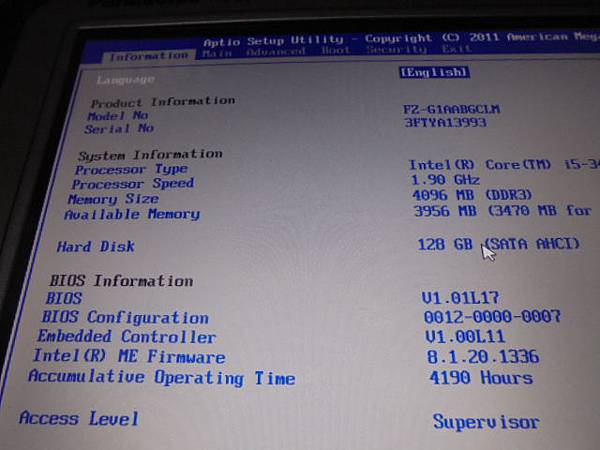 Panasonic松下FZ-G1~平板電腦升及到Windows 10→開機出現符號後轉黑屏~系統還原亦失敗→要解決異常問題繼續使用~開機進入BIOS→臺北市信義路-李先生【原廠型號與硬體規格】