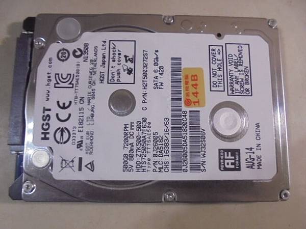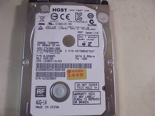 HGST昱科500GB SATA→7mm硬碟裝在ASUS華碩筆記型電腦~忽然開機讀不到硬碟→華碩判定硬碟讀取異音~要救回圖檔交稿→原廠標籤產地CHINA~新北市中和區-盛小姐【AUG-14出廠已過三年】