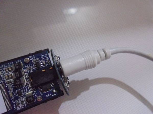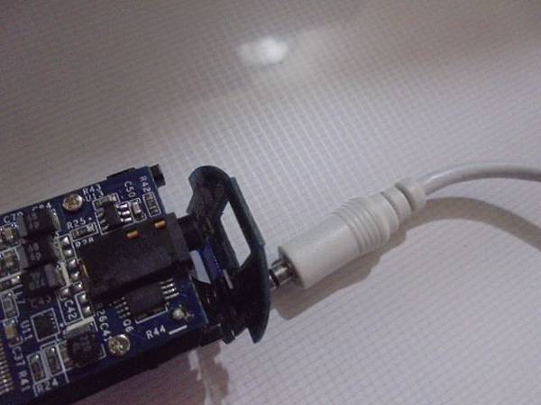 PODIO百剛BA-205 2GB→MP3隨身音樂棒插在遊覽車上做充電播放~卻聞到燒焦味→按電源鍵無法開機~想修好給家人使用→備妥白色耳機充電線~新北市板橋區-林先生【筆直插入音樂棒本體耳機孔】