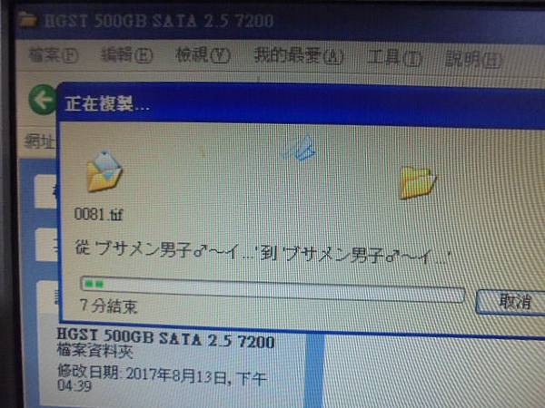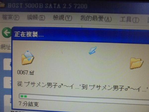 HGST昱科500GB SATA→7mm硬碟裝在ASUS華碩筆記型電腦~忽然開機讀不到硬碟→華碩判定硬碟讀取異音→要救回圖檔交稿~正在複製.tif檔案7分結束→新北市中和區-盛小姐【正在複製7分結束】