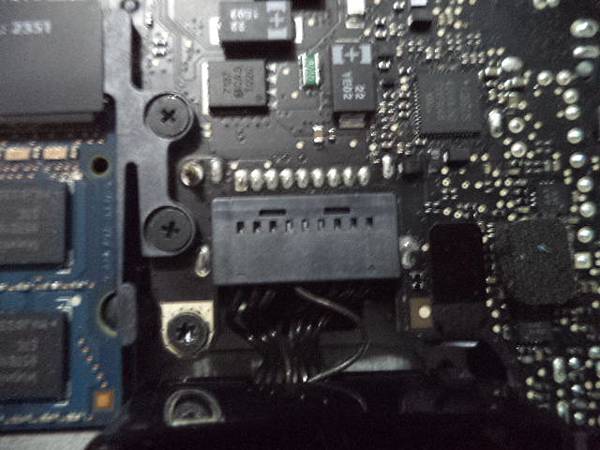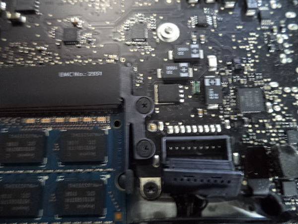 Apple蘋果MacBook Pro~A1278筆記型電腦→不知原因原廠電池自行膨脹鼓起~頂到外殼已變形→必需更換原廠電池後繼續使用~緊扣在主機板位置的原廠BATTERY排扣→新北市板橋區-薛先生【亦將之拔除】