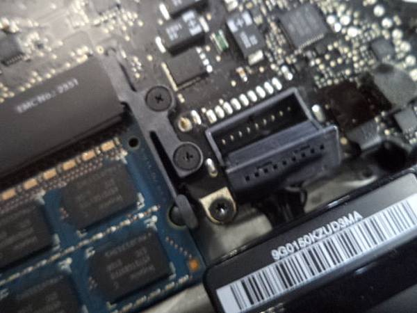 Apple蘋果MacBook Pro→A1278筆記型電腦~不知原因原廠電池自行膨脹鼓起→頂到外殼已變形~必需更換原廠電池後繼續使用→原廠BATTERY右側螺絲固定孔~新北市板橋區-薛先生【亦被鼓起的電池撐斷】 Apple蘋果MacBook Pro~A1278筆記型電腦→不知原因原廠電池自行膨脹鼓起~頂到外殼已變形→必需更換原廠電池後繼續使用~原廠電池已拔離原本固定位置→新北市板橋區-薛先生【主機板周邊瞬時感覺很空洞】