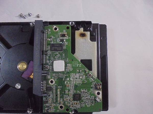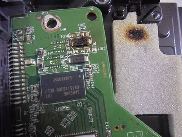 WD威騰3.5吋BLUE→2TB硬碟接在硬碟座連接電腦USB使用~電源變壓器發出奇怪聲音後→硬碟就無法讀取~要救回硬碟裏的檔案資料→硬碟電路板翻至正面看到燒毀的零件~新北市泰山區-簡先生【隔離泡棉明顯焦痕】