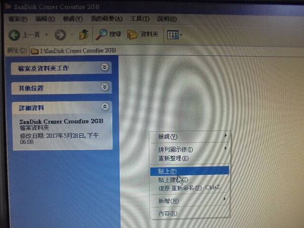 SanDisk新帝Cruzer Crossfire→2GB隨身碟插桌上型電腦讀取~不慎撞到USB接頭歪斜而無法使用→已救回隨身碟裏的檔案~滑鼠右鍵全選A資料夾SanDisk→花蓮縣吉安鄉-羅小姐【滑鼠右鍵點複製C】