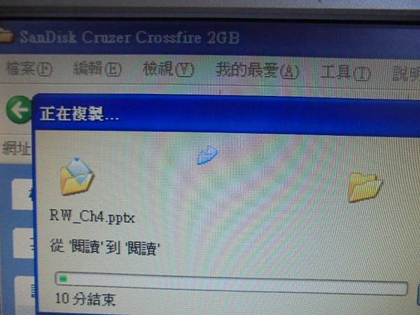 SanDisk新帝Cruzer Crossfire→2GB隨身碟插桌上型電腦讀取~不慎撞到USB接頭歪斜而無法使用→已救回隨身碟裏的檔案~正在複製進行中→花蓮縣吉安鄉-羅小姐【正在複製.pptx從閱讀到閱讀10分結束】