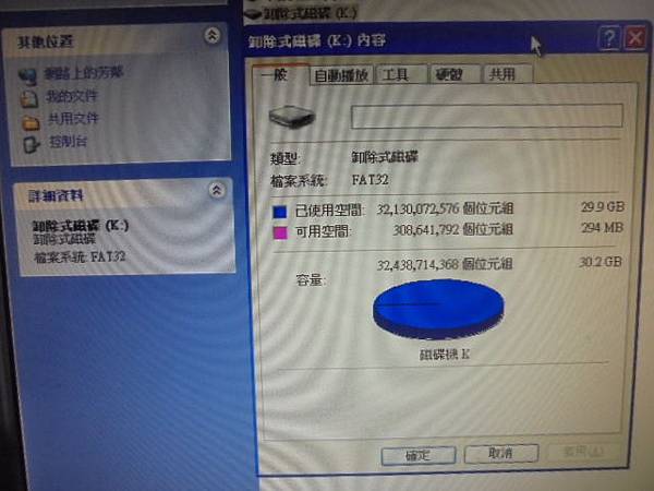 ADATA威剛C906→32GB隨身碟存進多種檔案資料~忽然某天照片影片就無法正常瀏覽播放→要救回儲存多年的相片影片~卸除式磁碟K→新北市板橋區-黃小姐【已使用空間29.9GB可用空間294MB】