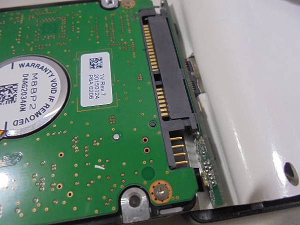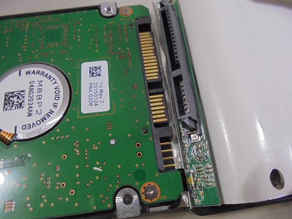 Seagate希捷SRD00F1~1TB外接硬碟連接電腦突然出現異音無法讀取→就近送NOVA店家拆殼判定亦無法處理~要救回PSD美工圖檔→翻開白色隔離紙拉出SATA轉接板~桃園市中壢區-陳小姐【轉接電路板與裸碟分離】