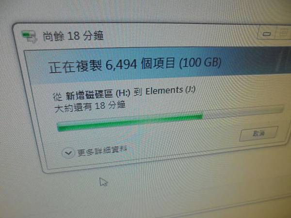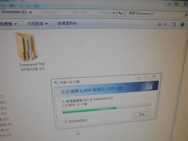 Transcend創見760 USB 3.0~32GB隨身碟插在筆記型電腦使用→點選磁碟出現未格式化~已救回儲存多年的相片影片→從新增磁碟區H到Elements J~新北市板橋區-李先生【大約還有18分鐘】 Transcend創見760 USB 3.0→32GB隨身碟插在筆記型電腦使用~點選磁碟出現未格式化→已救回儲存多年的相片影片~大約還有30分鐘→新北市板橋區-李先生【正在複製6494個項目100GB】