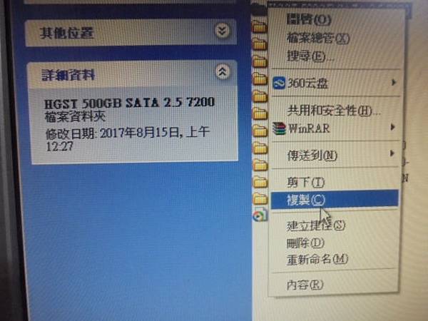 HGST昱科500GB SATA→7mm硬碟裝在ASUS華碩筆記型電腦~忽然開機讀不到硬碟→華碩判定硬碟讀取異音~已救回工作圖檔→滑鼠點選滑鼠右鍵顯示工具列~新北市中和區-盛小姐【下拉至複製C點選】