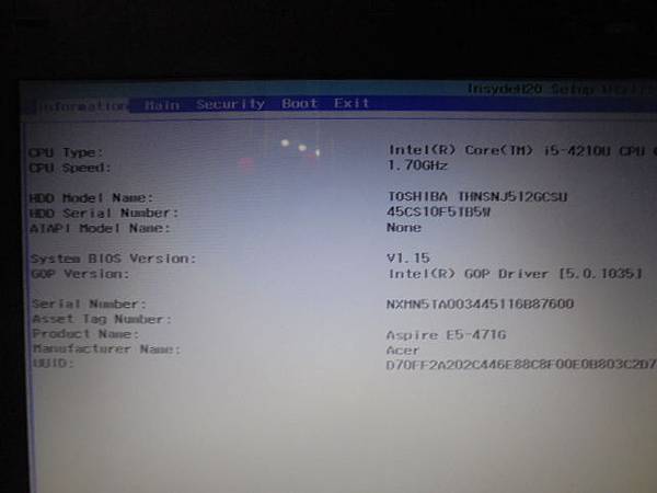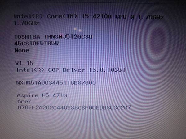 ACER宏碁E5-471G~筆記型電腦開機後沒有運作時→磁碟處理程序過高~作業系統用起來卡卡的→已更換固態硬碟解決問題~壓下NB電源開機進入BIOS→新北市樹林區-顏小姐【SSD品牌型號正確】
