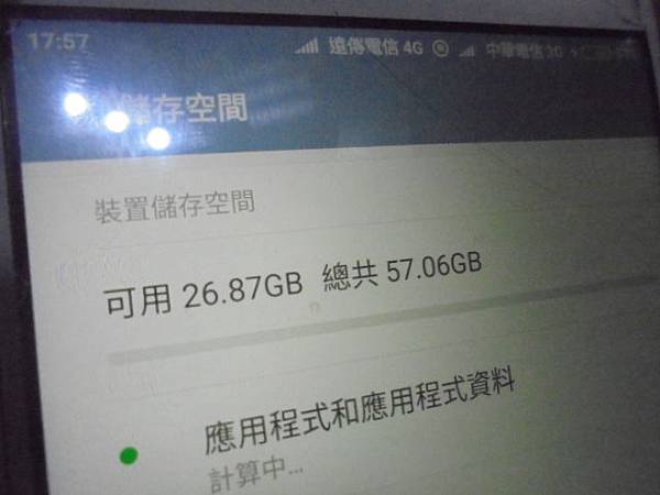 Xiaomi小米紅米Note 4→64GB智慧型手機因卡卡的做重開機後~就停在mi畫面進不了作業系統→要修好手機救回APP登入的驗證碼~裝置儲存空間→新北市板橋區-蘇先生【可用26.87GB總共57.06GB】 Xiaomi小米紅米Note 4~64GB智慧型手機因卡卡的做重開機後→就停在mi畫面進不了作業系統~要修好手機救回APP登入的驗證碼→檔案複製完成後回到手機點進設定~新北市板橋區-蘇先生【滑到儲存空間後點入】