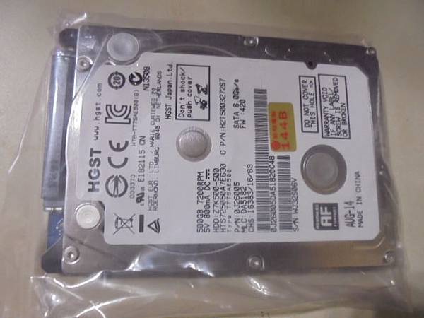 HGST昱科500GB SATA~硬碟裝在ASUS華碩筆記型電腦→貓咪曾於NB上跳躍~經華碩判定硬碟讀取異音無能力處理→已救回工作圖檔→套有塑膠袋的裸碟~新北市中和區-盛小姐【再置進原本包裝東芝SSD氣泡袋】