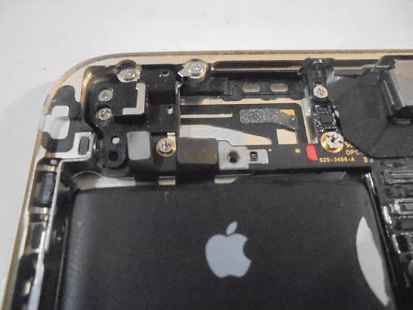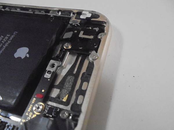 Apple蘋果iPhone 6~64GB智慧型手機不慎手滑掉進浴缸裏泡水→由浴缸取出後已經無法開機~手機掉進水中時仍在開機狀態→要救回超過一萬個相片影片檔案~拆下排線上方的金屬片→新北市板橋區-吳小姐【與兩顆十字螺絲放在一起】