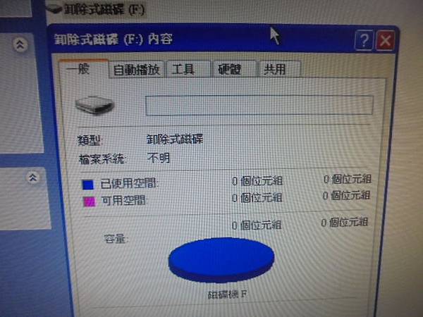 ADATA威剛Micro SDHC 4~32GB記憶卡使用於LG樂金手機→螢幕突然出現需格式化視窗~經檢測後判定為物理性損壞→卸除式磁碟F插入磁片~新北市土城區-吳小姐【已使用空間╱可用空間0個位元組】 ADATA威剛Micro SDHC 4→32GB記憶卡在LG樂金手機使用~螢幕突然出現需格式化視窗→要救回畢業旅行的相片影片~再經120小時物理性處理後→新北市土城區-吳小姐【記憶卡插讀卡機連接電腦】