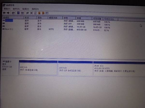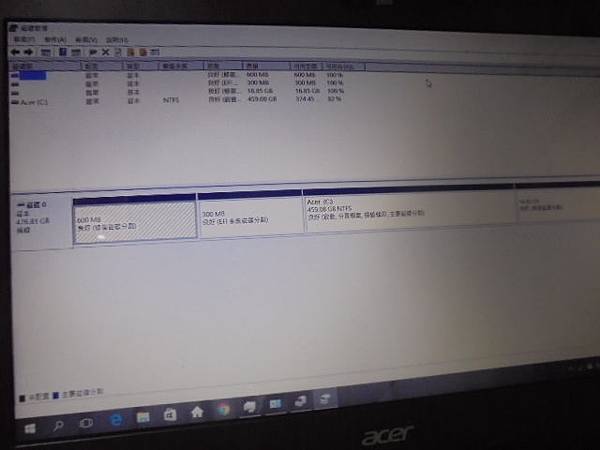 ACER宏碁E5-471G~筆記型電腦開機後沒有運作時→磁碟處理程序過高~作業系統用起來卡卡的→已更換固態硬碟解決問題~磁碟0良好600MB→新北市樹林區-顏小姐【C良好459.08GB】