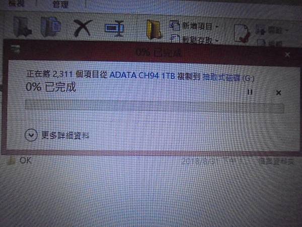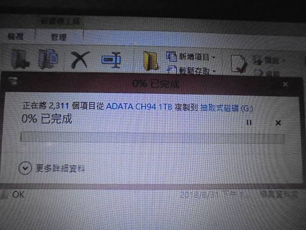 ADATA威剛CH94→1TB行動硬碟連接電腦存取~彈出尚未格式化視窗但不敢按是→先請同事幫忙卻說無法處理~要救回教學文件及孩子的相片影片檔案資料→正在將2311個項目複製到抽取式磁碟G~新北市板橋區-張小姐【0%已完成】