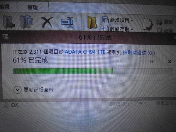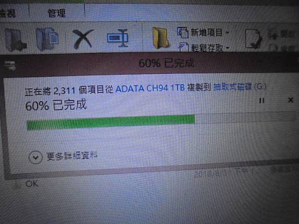 ADATA威剛CH94→1TB行動硬碟連接電腦存取~彈出尚未格式化視窗但不敢按是→先請同事幫忙卻說無法處理~要救回教學文件及孩子的相片影片檔案資料→正在將2311個項目複製到抽取式磁碟G~新北市板橋區-張小姐【60%已完成】