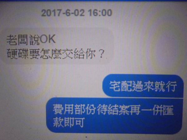 Seagate希捷3.5吋1TB~Lemel聯強桌上型電腦搭載硬碟→讀取異音後先送DRS迪亞士~經開蓋後判定無法處理做退件→要救回公司重要檔案~6月3日通知以當日配寄出→臺北市仁愛路-陳小姐【下午回覆收到但宅配單已濕】 Seagate希捷3.5吋1TB→Lemel聯強桌上型電腦搭載硬碟~讀取異音後先送DRS迪亞士→經開蓋後判定無法處理做退件~要救回公司重要檔案→客戶說已過宅急便收件時間~臺北市仁愛路-陳小姐【回覆宅配通收到18點】
