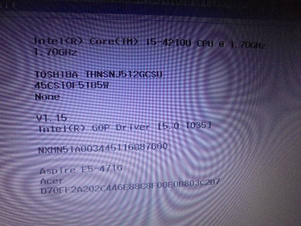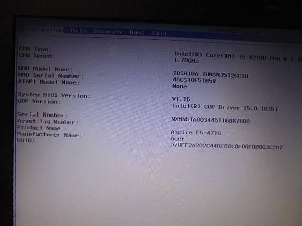 ACER宏碁E5-471G→筆記型電腦開機後沒有運作時~磁碟處理程序過高→作業系統用起來卡卡的~更換SSD硬碟解決問題→壓電源鍵開機進入BIOS~新北市樹林區-顏小姐【東芝SSD硬碟型號正確】