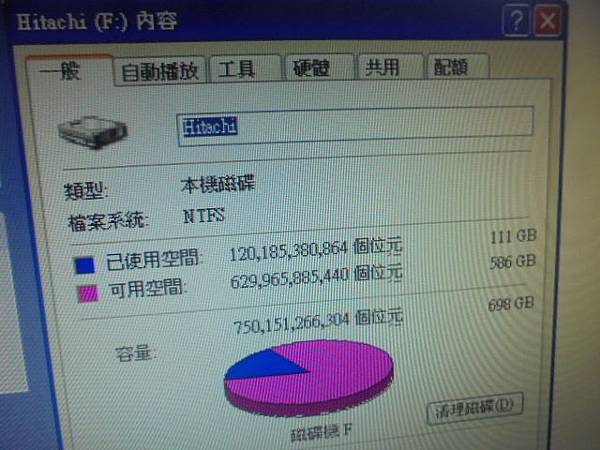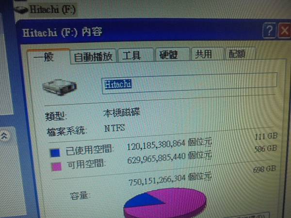 HITACHI日立Touro Mobile Pro~750GB行動硬碟→連接電腦有亮指示燈~電腦卻讀不到裝置→檢測判定使用完全正常~本機磁碟F:→新北市板橋區-簡小姐【可用空間586GB大小總計698GB】