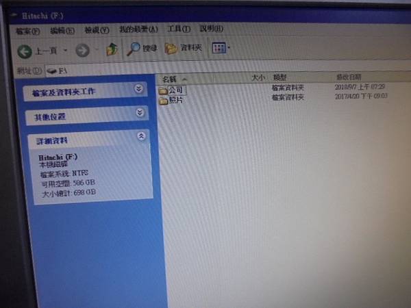 HITACHI日立Touro Mobile Pro~750GB行動硬碟→連接電腦有亮指示燈~電腦卻讀不到裝置→檢測判定使用完全正常~點進Hitachi F:→新北市板橋區-簡小姐【僅有公司與照片兩個資料夾】