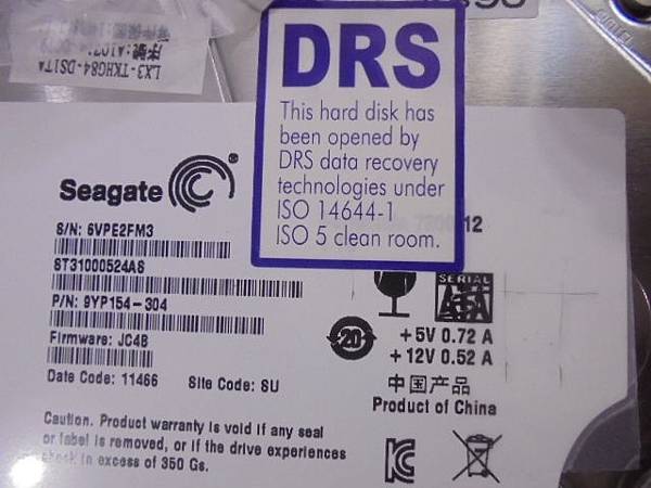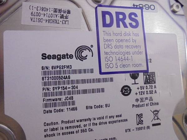 Seagate希捷3.5吋1TB→Lemel聯強桌上型電腦搭載硬碟~讀取異音後先送DRS迪亞士→經開蓋後判定無法處理做退件~要救回公司重要檔案→左側貼有Lemel聯強料號貼紙~臺北市仁愛路-陳小姐【右側貼了DRS維修標籤】