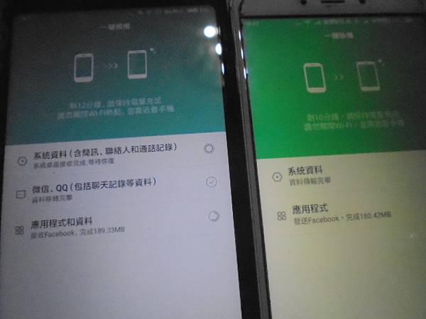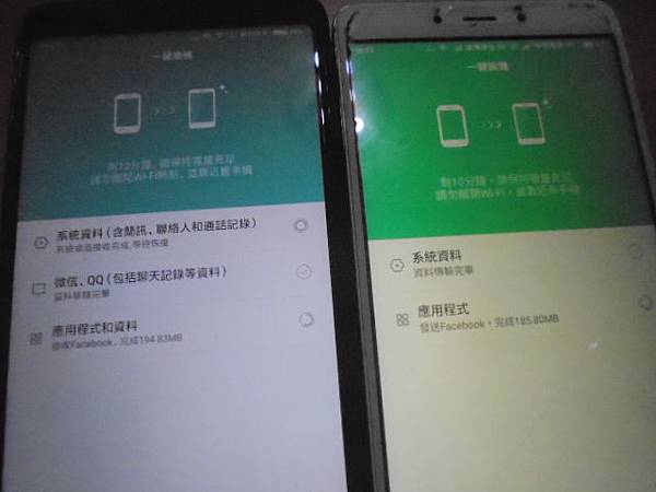 Xiaomi小米紅米Note 4~64GB智慧型手機因卡卡的做重開機後→停在mi進不了Android~已修好手機救回登入APP的相關驗證→一鍵換機仍持續在備份與發送~新北市板橋區-蘇先生【將鏡頭拉遠拍進兩隻手機】