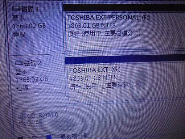 TOSHIBA東芝A2行動硬碟2TB~Micro USB 3.0接座損壞無法使用→送至原廠判定亦無法解決問題~複製硬碟裏重要的檔案資料→磁碟1磁碟2均為TOSHIBA~新北市土城區-林先生【1863.02GB】 TOSHIBA東芝A2行動硬碟2TB→Micro USB 3.0接座損壞無法使用~送至原廠判定亦無法解決問題→已取出硬碟裏重要的檔案資料~滑鼠點選存放裝置磁碟管理→新北市土城區-林先生【G磁碟F磁碟檔案系統正確】