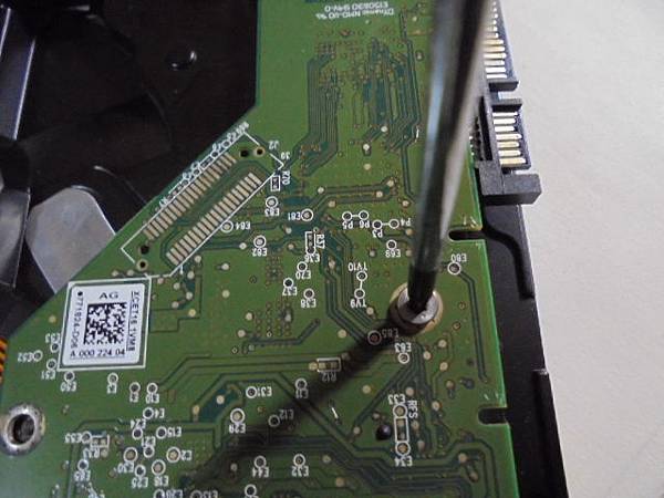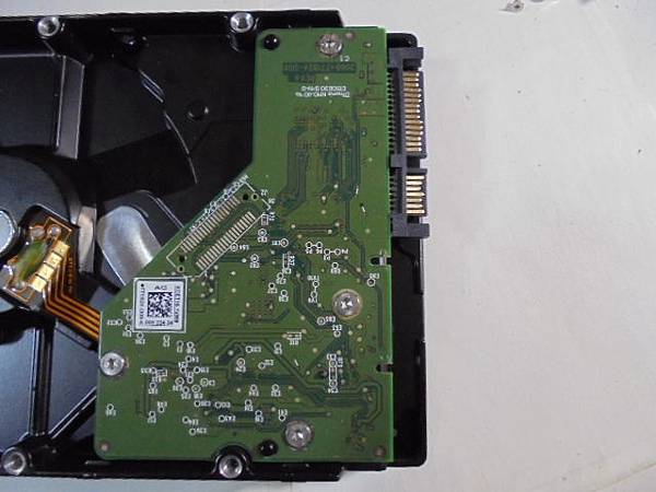WD威騰1TB~3.5吋BLUE硬碟於組裝電腦使用→自行更換電腦零件時不慎摔到硬碟~折壞7Pin訊號端SATA接座→要救回硬碟中的重要檔案資料~將焊好接座的硬碟電路板→新北市鶯歌區-邱先生【置於硬碟本體對準4個螺絲孔】