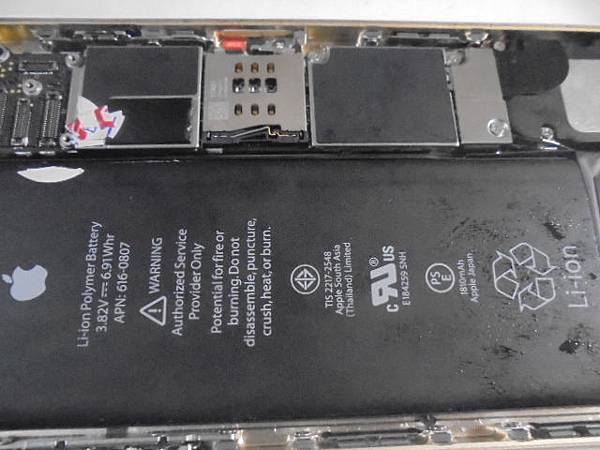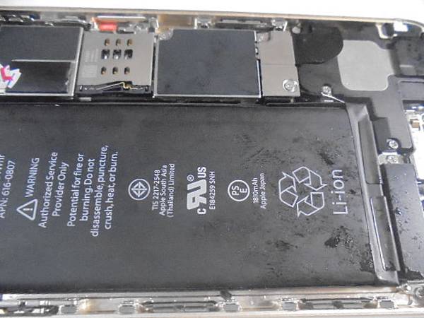 Apple蘋果iPhone 6~64GB智慧型手機不慎手滑掉進浴缸裏泡水→由浴缸取出後已經無法開機~手機掉進水中時仍在ON開機→已救回超過一萬個相片影片檔案~螢幕排線扣牢於電路板背面→新北市板橋區-吳小姐【置回金屬蓋對準5個螺絲孔】