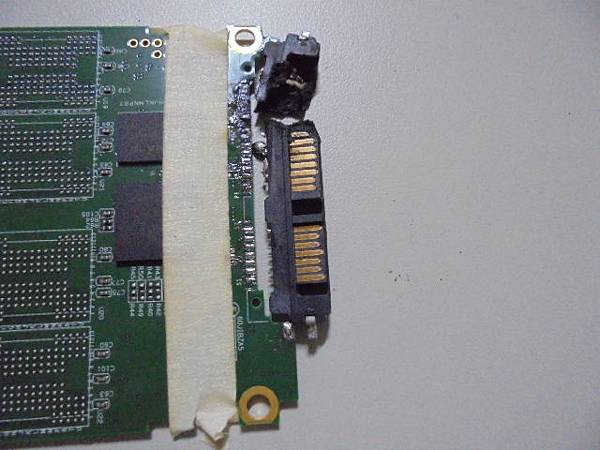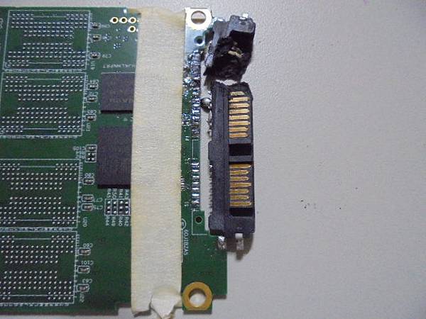 ADATA威剛SX930~240GB硬碟SSD接在組裝電腦→過完農曆年到公司開工~燒毀SATA接座電源接口→要救回公司重要檔案資料~約十多分鐘後順利拆解被燒毀的SATA接座→嘉義縣水上鄉-簡先生【置於電路板旁】