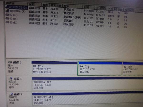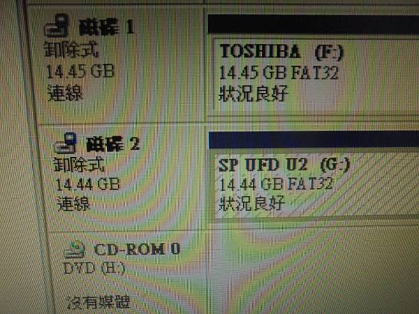 SP廣穎Ultima U03~16GB隨身碟插在電腦讀取→不慎撞到後導致USB接頭歪斜~已經完修隨身碟USB接頭→救回隨身碟裏所有檔案資料~滑鼠點選存放磁碟管理→臺北市內湖區-蔣小姐【磁碟區F磁碟區G檔案系統正確】