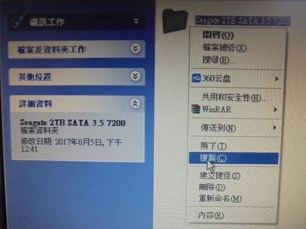Seagate希捷3.5吋2TB~組裝桌上型電腦使用硬碟→孩子翻倒開機使用中的電腦後斷電~再開機就讀不到硬碟→光華商場報價30K救援費用~滑鼠右鍵展開功能列表下拉至複製C→新北市板橋區-顧先生【滑鼠點選右鍵貼上P】 Seagate希捷3.5吋2TB→組裝桌上型電腦使用硬碟~孩子翻倒開機使用中的電腦後斷電→再開機就讀不到硬碟~要救回硬碟裏重要的網拍檔案→點選進入後展開6個子資料夾列表~新北市板橋區-顧先生【建立日期均與原本相同】