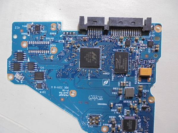 TOSHIBA東芝8TB→3.5吋企業及硬碟於組裝電腦使用~自行更換電腦零件時不慎摔到硬碟→折斷SATA接座7Pin訊號塑膠片~想修好硬碟接座繼續使用→將硬碟電路板翻至背面~新北市鶯歌區-邱先生【目視電路板焊接位置均無異常】