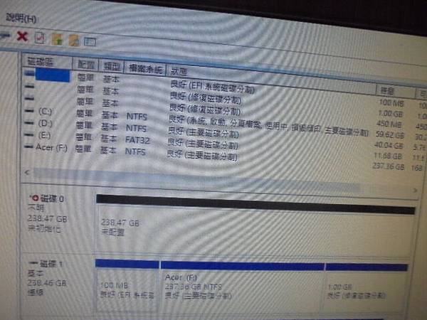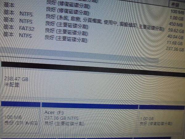 ACER宏碁SF314-51~筆記型電腦更新作業系統後→就進不去Windows 10~送原廠亦無法解決→已救回桌面的檔案資料~磁碟1基本238.46GB→新北市汐止區-周小姐【100MB良好EFI系統磁碟】