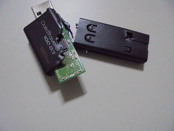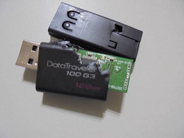 Kingston金士頓DT100G3→128GB隨身碟插在ASUS筆電隨掉落地面後~折彎USB 3.0接頭→送SET復得判定救回檔案要三萬多元~要救回工作的檔案資料→必需弄開外殼才能取出電路板~臺北市大安區-賴小姐【設法以工具剪開機構外殼】