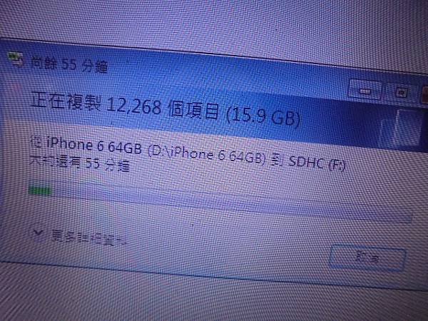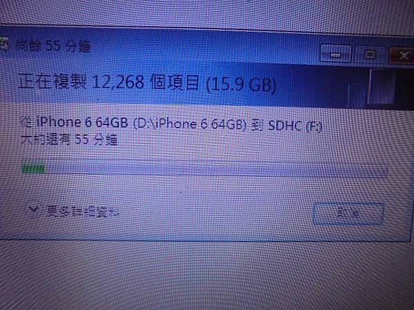 Apple蘋果iPhone 6→64GB智慧型手機不慎手滑掉進浴缸裏泡水~由浴缸取出後已經無法開機→設法修好主機板讓手機正常開機~已救回超過一萬個相片影片檔案→電腦SDHC F:DCIM~新北市板橋區-吳小姐【正在複製12268個項目15.9GB】