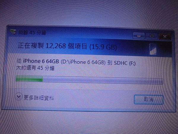Apple蘋果iPhone 6~64GB智慧型手機不慎手滑掉進浴缸裏泡水→由浴缸取出後已經無法開機~手機掉進水中時仍在ON開機→已救回超過一萬個相片影片檔案~尚餘55分鐘正在複製12268個項目15.9GB→新北市板橋區-吳小姐【大約還有55分鐘】