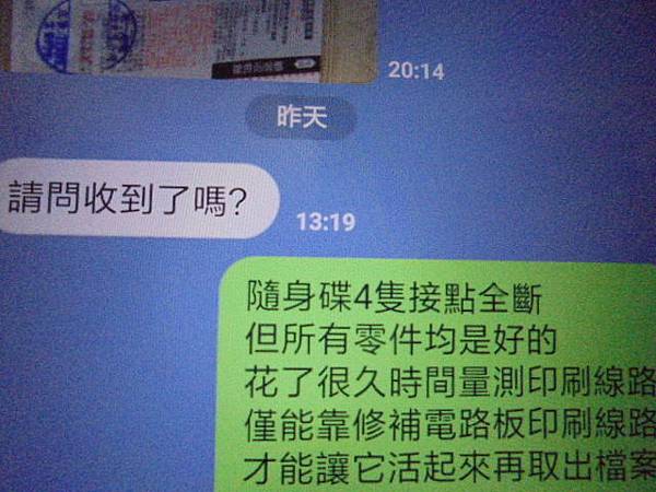 Transcend創見370→32GB隨身碟插在桌上型電腦被陌生人踢壞~撞彎USB接頭導致無法讀取→送當地店家判定印刷線路斷裂而無法維修~要救回工作上的檔案資料→LINE詢問是否收到~雲林縣斗六市-蔡小姐【回覆檢測與判定問題後的說明與估價】