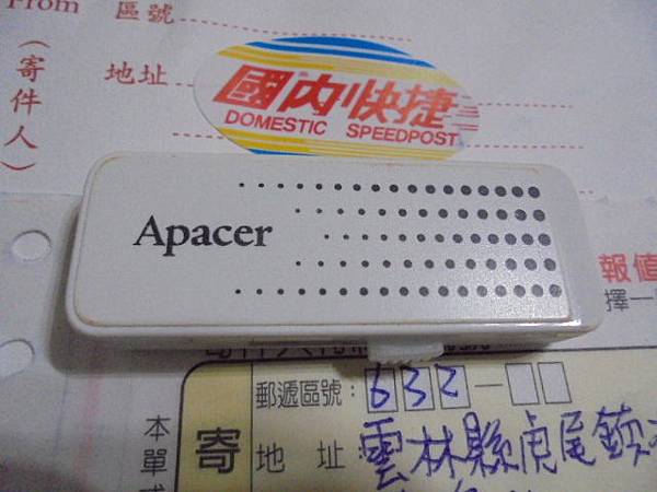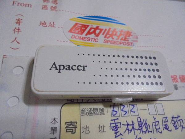 Apacer宇瞻8GB~AH323隨身碟檔案皆是正常讀取使用→送至店家做圖像輸出時~懷疑隨身碟是感染了病毒→但是不知道該找誰救援~要救回工作上的檔案資料→右下角郵戳為虎尾科技大學郵局~雲林縣虎尾鎮-陳小姐【拆開包裹取出Apacer隨身碟】