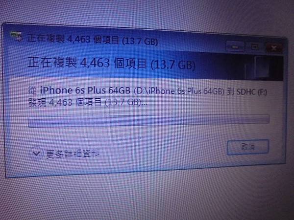 Apple蘋果iPhone 6s Plus~64GB智慧型手機被家人拿榔頭敲壞螢幕→導致手機無法觸控~已更換新螢幕總成→以iTunes備份全數檔案資料~尚餘25分鐘從iPhone 6s Plus 64GB到SDHC F:→新北市板橋區-鄭先生【大約還有25分鐘】