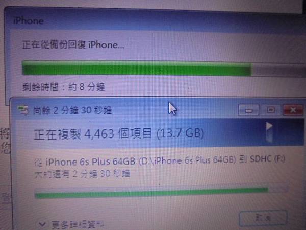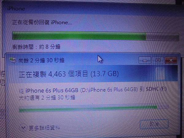Apple蘋果iPhone 6s Plus→64GB智慧型手機被家人拿榔頭敲壞螢幕~導致手機無法觸控→經更換新螢幕總成後~已救回內建記憶體中的相片影片→3分鐘30秒鐘正在複製4463個項目13.7GB~新北市板橋區-鄭先生【從iPhone 6s Plus 64GB到SDHC F:】