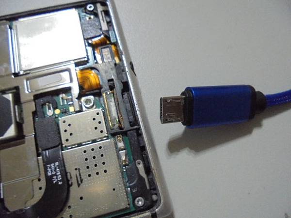 NOKIA諾基亞Lumia 925~16GB智慧型手機不知原因無法開機→插上充電線但沒有亮充電燈號~想修好這隻手機繼續做使用→卻不想送代理商維修~備妥Micro USB充電線對準手機頂端的接座→臺北市內湖區-許先生【將Micro USB充電線插上手機】