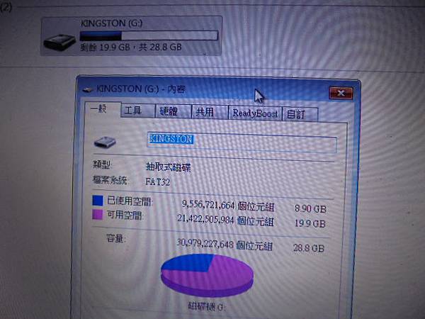 RiDATA錸德OJ15~32GB隨身碟在家裏的MSI微星NB是正常讀取→帶至學校插上桌上型電腦做存取作業檔案~不明原因所有檔案全數消失不見→已救回作業PSD美工圖檔~KINGSTON G:→新北市土城區-陳先生【已使用空間8.9GB可用空間19.9GB容量28.8GB】