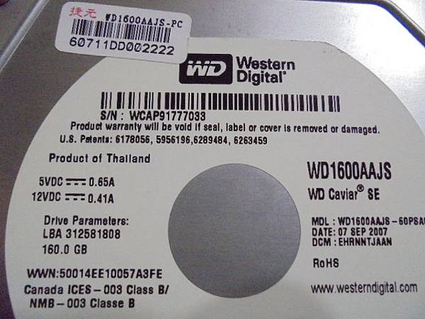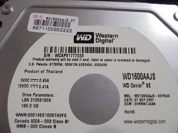 WD威騰3.5吋~160GB硬碟為Genuine捷元PC電腦出廠搭載→開機無法進入作業系統~送附近店家判定硬碟電路板異常無能力處理→要救回硬碟中重要工作檔案資料~依據正面原廠標籤出廠日期推測→臺北市西園路-陳先生【碟片讀寫頭應是老化或熱變形】
