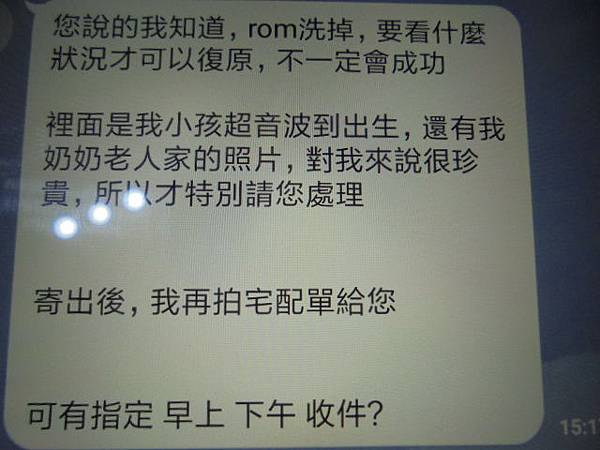 OPPO歐珀R15~128GB智慧型手機儲存很多且重要的影像檔案→於恢復原設定選項中先按清除全部內容與設定~再點還原系統設定→想救回內建記憶體中重要的影像~以LINE文字說明手機裏面珍貴照片的由來→新竹縣竹東鎮-林先生【7月9日通知已寄出】