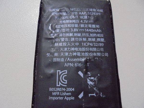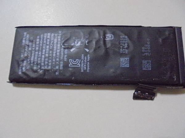 【判定問題】Apple蘋果iPhone 5~32GB智慧型手機的Home鍵無法觸控→發現是電池膨脹頂開觸控螢幕~再導致手機左側邊框被電池撐開縫隙→要更換Li-ion解決全數異常狀況~將iPhone 5二手電池翻至背面→新北市中和區-張先生【容量3.8V 1440mAh】